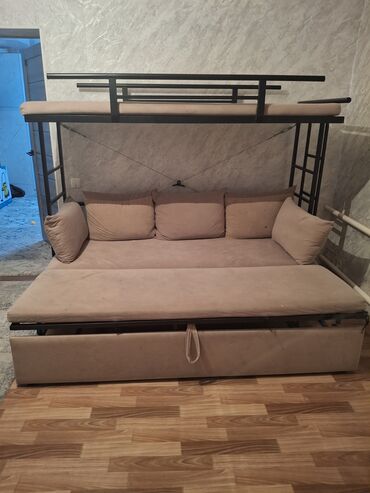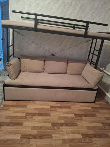 Двухъярусная кровать‑диван с металлическим каркасом и мягкими матрасами.