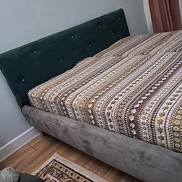 - Изголовье мягкое, обито тёмно‑зелёным велюром, декоративные утяжки с пуговицами под золото.
