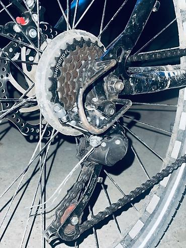 - Трансмиссия: система с тремя звездами спереди, кассета/трещотка сзади; задний переключатель Shimano Tourney.