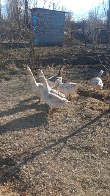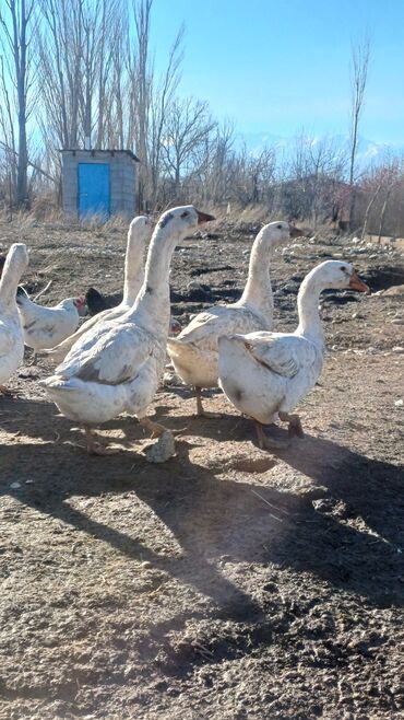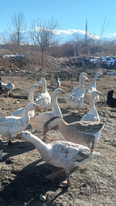 - Породы/типы: белые мясные и серые (в том числе гусыни с серыми отметинами и один серый гусак китайского/африканского типа с характерной выпуклостью на клюве).
