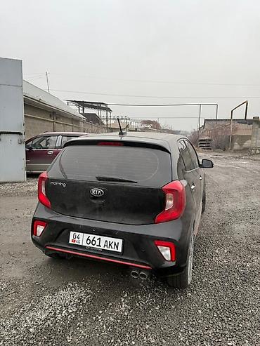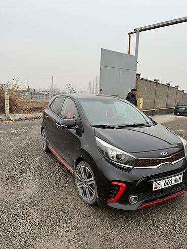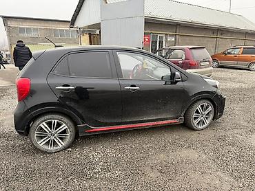 Kia Morning (Picanto) хэтчбек, 5 дверей, черный цвет с красными акцентами (спортивный пакет). Компактный городской автомобиль с выразительной оптикой и агрессивным бампером.