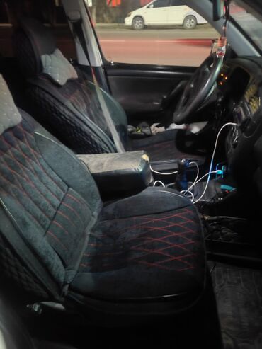 - Интерьер: тканевая обивка с чехлами на сиденьях (красная прострочка, ромбовидные вставки), высокая спинка и подголовники, передний подлокотник.