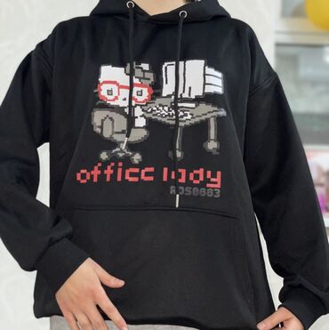 - Худи черное с капюшоном и карманом-кенгуру. Пиксельный принт «office lady» с персонажем за компьютером, шнуры капюшона с металлическими наконечниками.