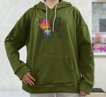 - Худи оливкового цвета с капюшоном и карманом-кенгуру. На груди — яркий многоцветный принт в виде крыла/бабочки и мотивационная надпись на английском.