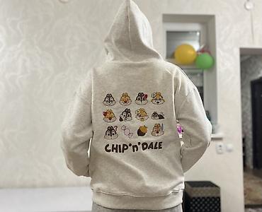 - Дизайн: светло‑меланжевая основа. Небольшой принт на груди с персонажами, крупный принт на спине с разными эмоциями и надписью “Chip ’n’ Dale”.