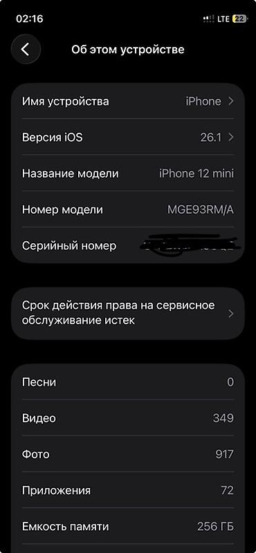 - На скриншоте «Об этом устройстве» отображается: iPhone 12 mini, модель MGE93RM/A, объём памяти 256 ГБ.