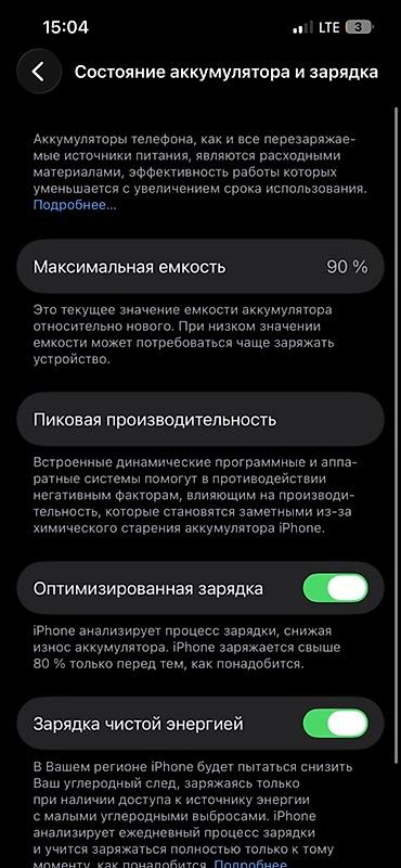 - Аккумулятор: максимальная ёмкость 90%, пиковая производительность поддерживается; включены «Оптимизированная зарядка» и «Зарядка чистой энергией»