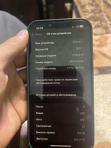 На скриншотах раздела «Об этом устройстве» указаны: название модели iPhone 14, версия iOS 18.3, модель MPVX3KH/A, серийный номер, объём памяти 256 ГБ.