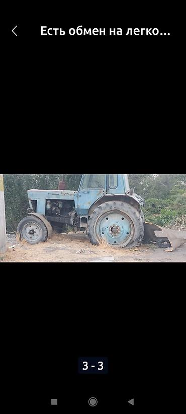 Трактор колесный с кабиной, синий. Передняя часть без облицовочных панелей, видны узлы и проводка. Колея задних колес широкая, установлены большие сельскохозяйственные шины, спереди — меньшие колеса. На тракторе имеется навеска/рамка под навесное оборудование, спереди — площадка/крепления, рядом лежит отвал-лопата. Кабина остекленная, с дверью и верхними габаритами. Выпускная труба вертикальная. Машина подходит как база под восстановление, донор запчастей или для переделки под коммунальные/подсобные работы: установка отвала, щетки, прицепного инвентаря, мотопомпы и т. п. Хорошо подойдет для пахоты небольших участков, транспортных задач по хозяйству и сезонной очистки территории при соответствующем обслуживании и доработке. На фото показано текущее состояние узлов, колеса, кабины и навески. Текст в объявлении: «Есть обмен на легко…».