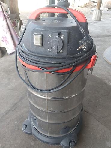 - Промышленный пылесос для сухой/строительной пыли с металлическим баком на колесах. На крышке – кнопка питания и розетка для синхронного подключения электроинструмента.