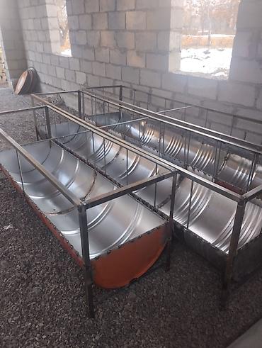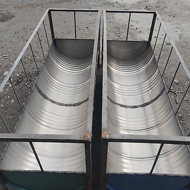 Примерные габариты одного секционного желоба на фото: длина около 2–2,5 м, ширина ~60–70 см, высота ~70–80 см. Секции можно соединять в линейку.