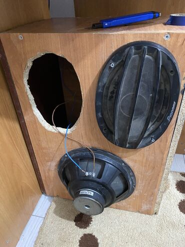 - Посадочные места: одно овальное под коаксиальный динамик Pioneer (установлена декоративная решётка), одно круглое под низкочастотный динамик 10–12". Круглый динамик показан отдельно, подключён проводами.