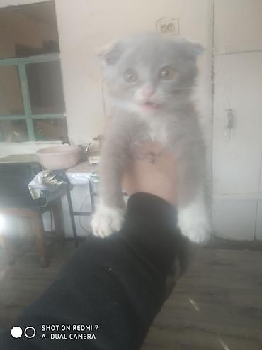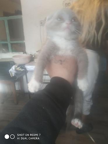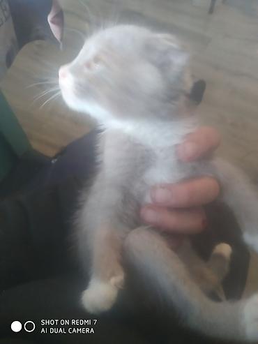 Котёнок, окраса серый с белыми “носочками” и грудкой. Ушки прижатые