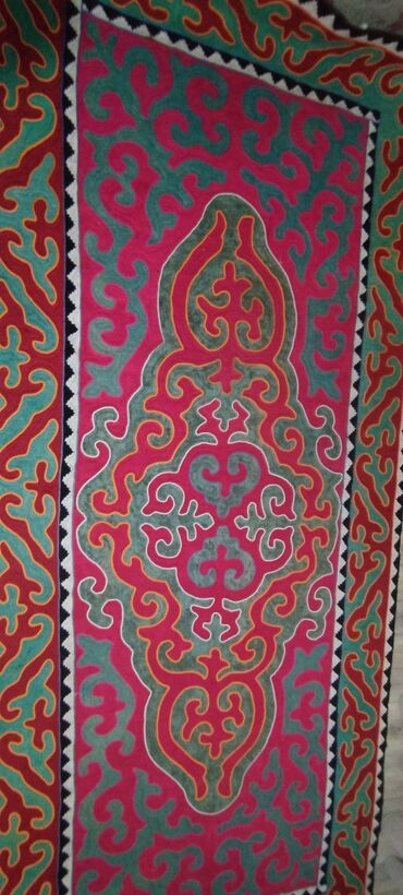 НациональныйЯркий ковер (шырдак ) Ручная работа. С традиционным орнаментом, выполненный в технике аппликации. Изделие прямоугольной формы, украшено геометрическими узорами и стилизованными растительными мотивами в насыщенных оттенках.