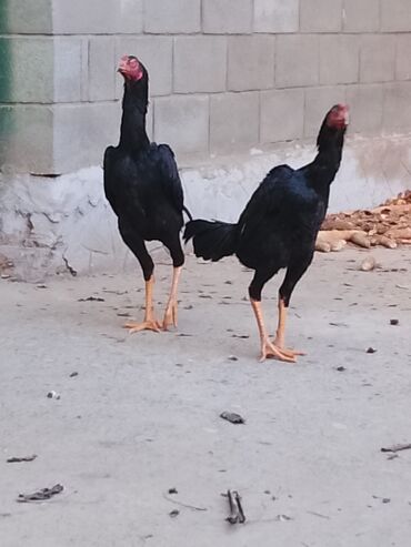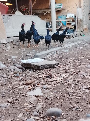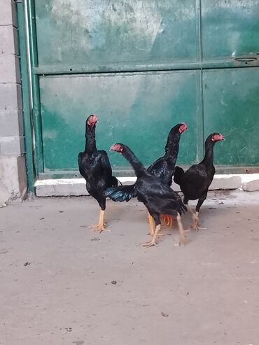 Петухи бойцовой породы (похоже на азиатский тип, высокий корпус и длинные ноги). Окрас: черный с зелёным отливом, у одного петуха серебристая грива. Крупные гребни, мощные ноги, плотное оперение, х...