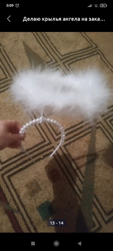 - Материал: легкий белый фоамиран/ткань с мерцающей фактурой, многослойные перья.