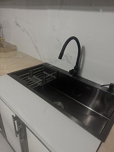 - Смеситель: черный, с столешницей под камень.