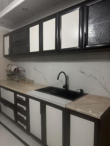 - Комплектация: напольные и навесные шкафы, столешница, стеновая панель (фартук), мойка с черным смесителем и встроенным дозатором для моющего средства, пристольная сушилка/решетка над чашей.
