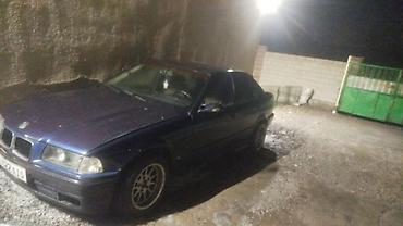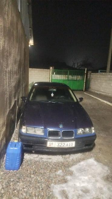 BMW 3 Series E36 купе, тёмно‑синий цвет кузова. Классический двухдверный кузов с фирменной решёткой радиатора BMW, передними двойными фарами и легкосплавными дисками. Низкий передний бампер, аэродинамичный силуэт, компактные свесы. В салоне: передние раздельные сиденья, рулевое колесо классического дизайна, подвесной ароматизатор.
