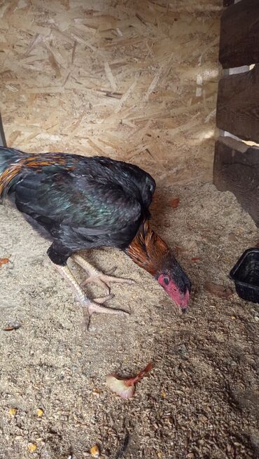Петух породы азиль (ориентировочно). Высокий, стройный, с мощными жёлтыми плюснами, прямой осанкой и вытянутой шеей. Окрас тёмный: чёрно-зелёное перо с рыже-бордовыми участками на крыльях и спине, ...