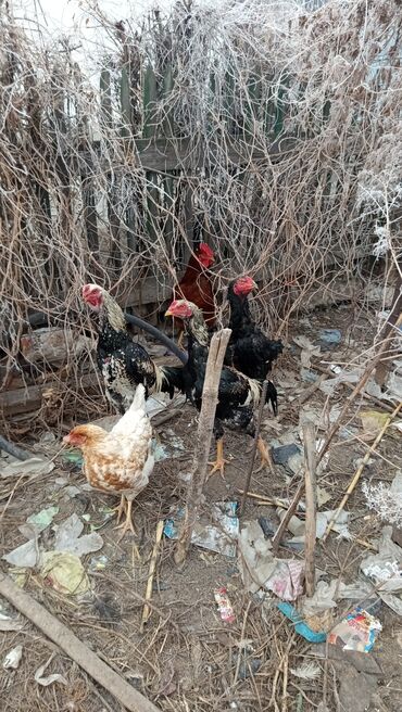 Петухи бойцовой породы (похоже на тип ашиль/азиль). Описание: - Высокие, вытянутые, крепкое телосложение, сильные ноги. - Оперение пестрое серо-черное, красные гребни и сережки. - Длинная шея с р...