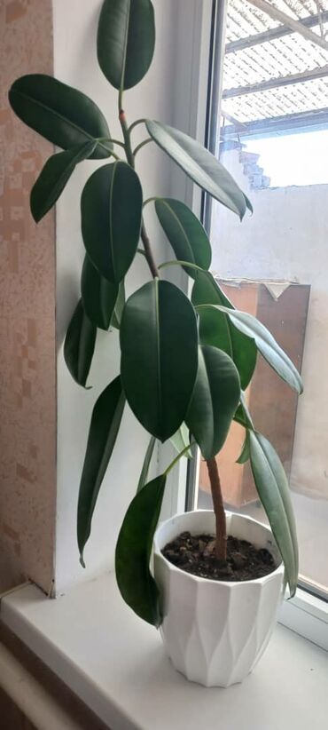 Фикус эластика (каучуковое дерево) в декоративном высоком кашпо. - Крупные глянцевые тёмно‑зеленые листья, плотная крона. - Посадка в высокие белые кашпо с фактурным рисунком; стильный минималисти...