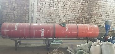 - Барабанная сушилка/гранулятор на раме: секционный вращающийся барабан из стальных бочек на силовой станине, продольные направляющие и роликовая опора, загрузка с торца от измельчителя/шнека, выгрузка через противоположный торец.