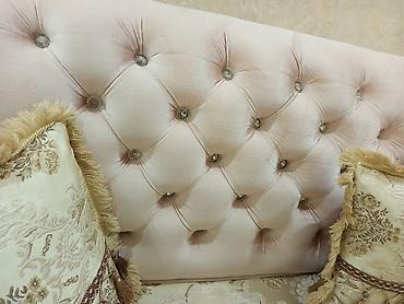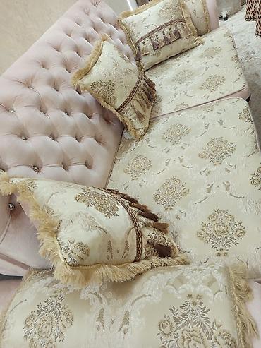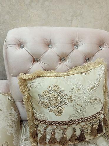 - Обивка: нежно-розовый велюр на каркасе и спинках; сиденья и подлокотники выполнены в жаккардовой ткани кремового оттенка с золотистым узором.