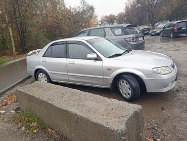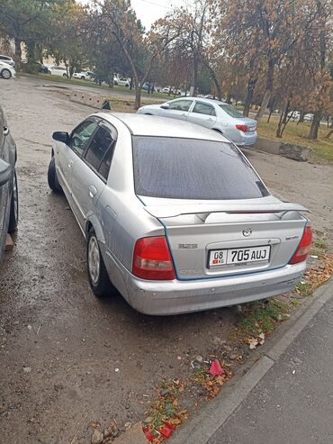 Mazda 323 седан, серебристый цвет, на кыргызских номерах (KG). Компактный городской автомобиль с экономичным бензиновым мотором и автоматической коробкой передач.