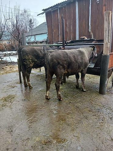 Описание: - На фото два бычка мясного направления. - Окрас: один черный, второй серо-бурый с белыми отметинами на ногах. - Содержатся в стойле, приучены к привязи. - Крупные, хорошо набирают масс...