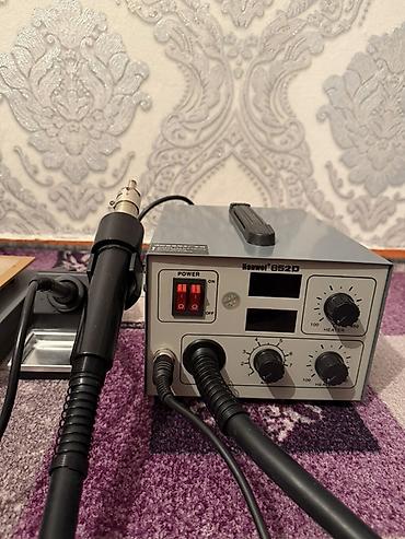 - Термовоздушная паяльная станция Hanwei 852D: цифровая индикация, отдельные ручки регулировки температуры и потока воздуха, разъем под фен и паяльник, сетевой тумблер на панели, держатель для фена в комплекте.