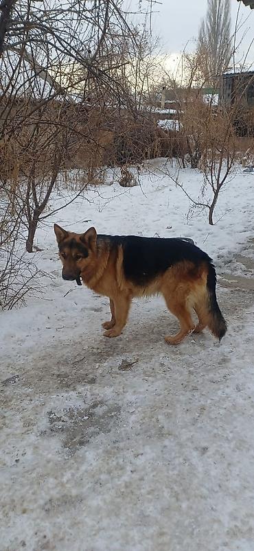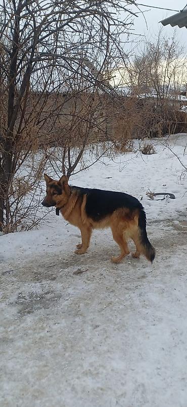 Немецкая овчарка, классический чепрачный окрас (черно-рыжий). Крупный, мощный кобель с плотным костяком, правильной посадкой ушей и густой двойной шерстью, хорошо приспособленной к холодному климату. Хвост пушистый, спина прямая, грудь широкая. На шее кожаный ошейник.