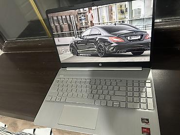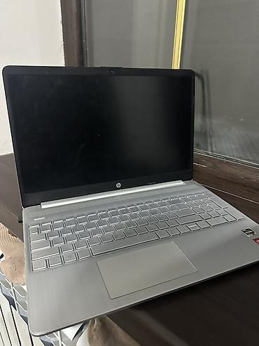 Ноутбук HP серебристого цвета, оснащенный процессором AMD Ryzen. Имеет полноразмерную клавиатуру с цифровым блоком и встроенную веб-камеру. В комплекте поставляется адаптер питания и мышь Logitech. Подходит для повседневных задач, работы и учебы.