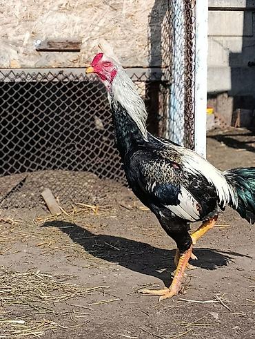 7 месяц Петух породы бойцового типа (возможный аналог аси́ль/шамо). Описание: - Высокий, сухой корпус, длинные ноги, прямой постав, выраженная мускулатура. - Окрас тёмный: чёрное перо с металличес...