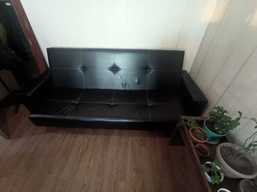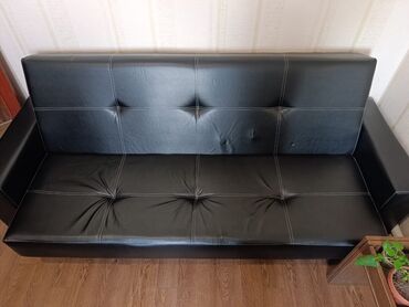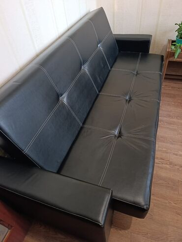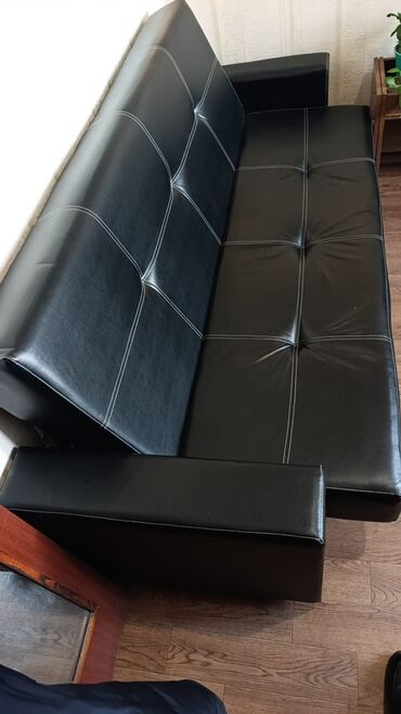 Диван прямой, 3‑местный, обит экокожей черного цвета с декоративной прострочкой контрастными белыми нитями и пуговичной стяжкой на сиденье и спинке. Прямые подлокотники средней высоты, жесткий каркас. Компактная глубина — удобно для небольших комнат, прихожих, офисов и приемных. Легко очищается: достаточно протереть влажной салфеткой, материал устойчив к пятнам и ежедневному использованию. Универсальный современный дизайн без лишних деталей подходит к большинству интерьеров в стиле минимализм/лофт/модерн. Возможна установка вплотную к стене. Цвет: черный. Материал обивки: экокожа (ПУ). Сиденье и спинка со стежкой квадратиками. Подлокотники прямоугольные. Каркас деревянный/металлический комбинированный (визуально). Размеры ориентировочно: длина около 2 м, глубина ~80–90 см, высота спинки ~85–95 см. Подходит для сидения 2–3 человек.
