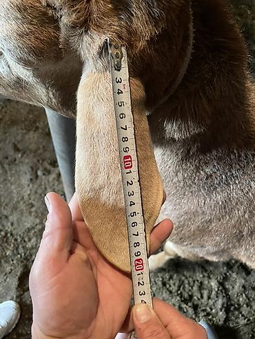 - Демонстрация фактических размеров на фото (уши и высота в холке показаны рулеткой)