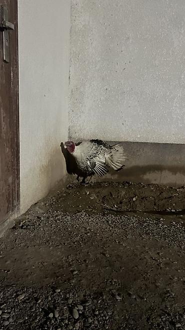 - Порода: предположительно пёстрый/серебристый тип, светлое оперение с тёмными вкраплениями.