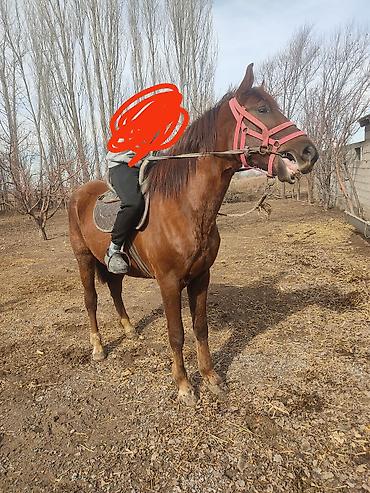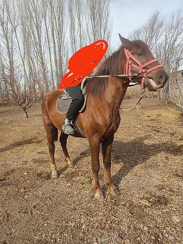 Лошадь (рыжая масть) в стойле. семиз тай сатылат 80 000сом, бооз бээ сатылат 110 000 сом - Масть: рыжая, отметина на лбу, светлые чулки на ногах частично. - Возраст: не указан (визуально молодой ко...