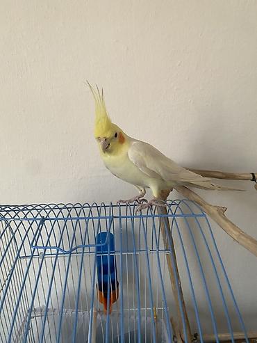 Попугай корелла с клеткой. Описание: - Вид: корелла (нимфа), окрас светлый с желтой маской и оранжевыми “щеками”. - В комплекте: металлическая клетка прямоугольной формы с выдвижным поддоном, двум...