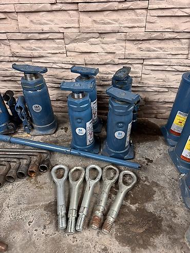 - Домкраты гидравлические «бутылочного» типа разной грузоподъёмности: на шильдиках видны модели 5 т и 10 т; несколько штук каждой позиции.