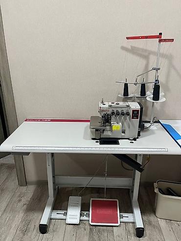 Готовое рабочее место: машина установлена на профессиональном столе BRUCE, настроена под 4 катушки. Идеально для небольшого ателье, цеха или домашней мастерской, где нужна стабильная скорость и аккуратная обметка.