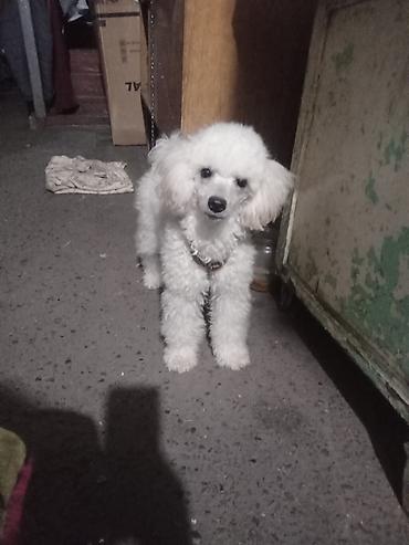 Пудель белого окраса, среднего размера, с курчавой шерстью.Привит. Не линяет,без запаха. Очень активный и игривый.Будет замечательным другом семьи.