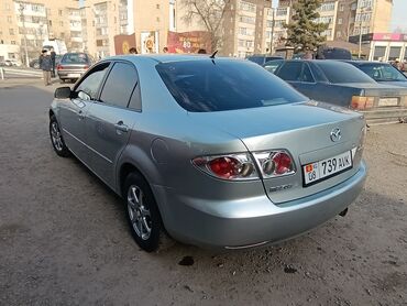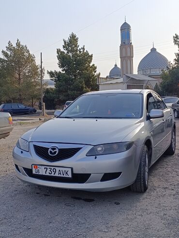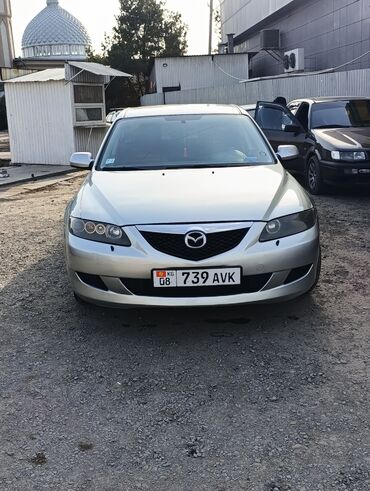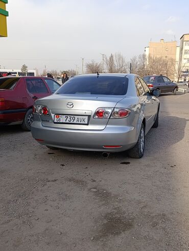 Mazda 6 седан, серебристый цвет кузова. Номерные знаки KG. Кузов первого поколения (рестайлинг до 2005/2007 не подтверждён по фото). Двигатель бензиновый, выхлоп одна труба слева. Передний привод, 4 двери, 5 мест.