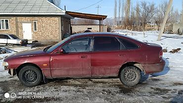 Mazda 626 (седан), красный цвет, киргизские номера. Кузов: - 4 двери, классический седан. - Передняя оптика прямоугольная, пластиковые бамперы. - Легкосплавные/штампованные диски с декоративными к...