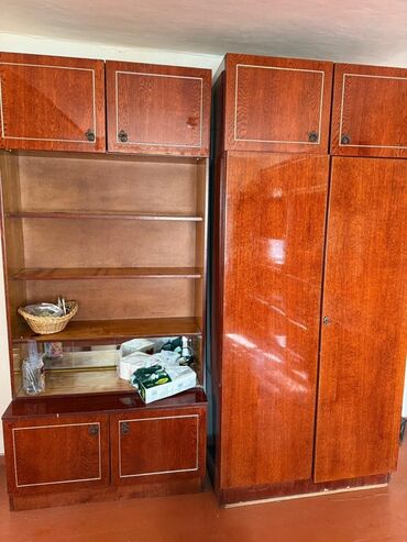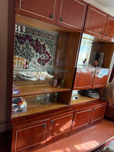 Секционная стенка советского образца из массива/шпона вишнёво‑коричневого цвета с декоративными рамками на фасадах.