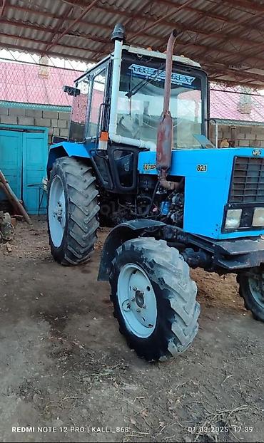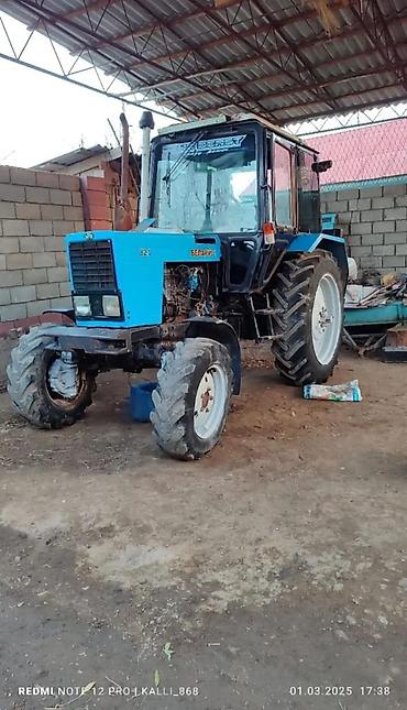 Трактор «Беларус» (МТЗ), кабина с остеклением и дворниками. Полный привод (виден передний ведущий мост), широкие сельхозшины. Передняя навеска/рамка под навесное, задняя тяга и гидравлика (стандарт...