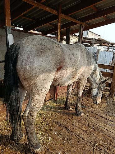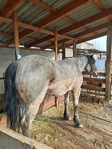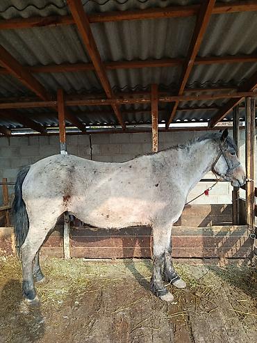 Лошадь серой масти (вороная грива и хвост), крупного телосложения. На фото — мерин/жеребец тяжёлого типа: мощная шея, широкая грудь, крепкие конечности с выражёнными щётками. Спокойный темперамент, стоит в поводу, без агрессии, адекватно реагирует на человека и кормление.
