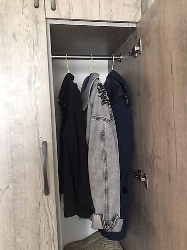 - Фурнитура: петли на доводчиках, металлические ручки темного цвета, металлическая штанга для вешалок.