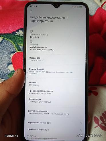 5000сом Кеми бар Смартфон Redmi 12C, модель 22120RN86G. Характеристики: - Память: 6 ГБ ОЗУ, 128 ГБ встроенной (занято ~75,4 ГБ). - Процессор: MediaTek Helio G85, 8 ...