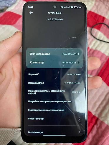 Смартфон Redmi Note 11, версия ОС 1.0.8.0 (TGCMIXM), Android 13 (13 TKQ1.221114.001). Встроенная память: 128 ГБ (доступно около 58,4 ГБ). Обновление системы безопасности Android: 2024‑10‑01.